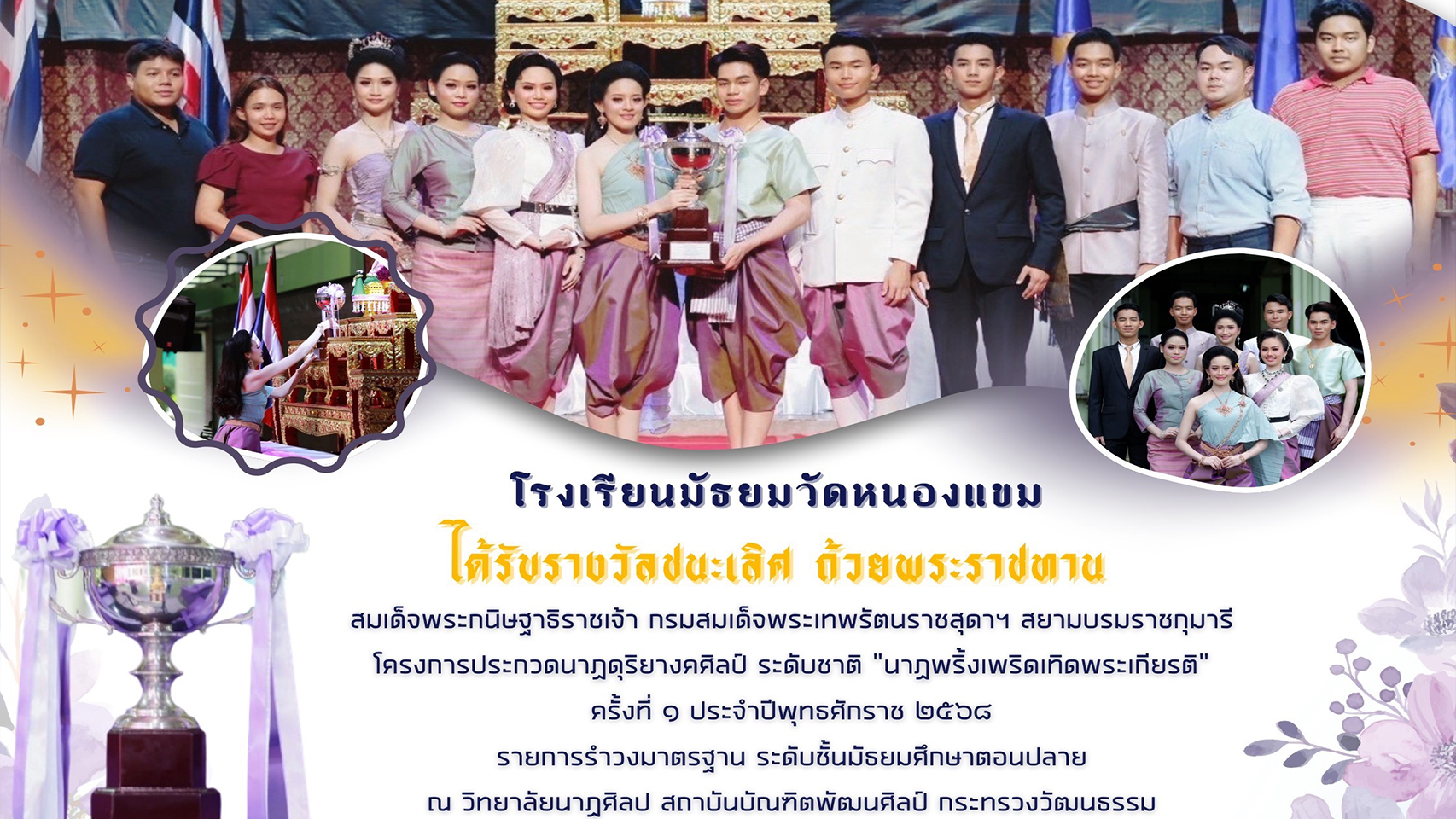 ชนะเลิศถ้วยพระราชทานสมเด็จพระกนิษฐาธิราชเจ้า กรมสมเด็จพระเทพรัตนราชสุดาฯ สยามบรมราชกุมารี โครงการประกวดนาฏดุริยางค์ศิลป์ระดับชาติ”นาฏพริ้งเพริดเทิดพระ เกียรติ” สาขารำวงมาตรฐาน พุทธศักราช 2568