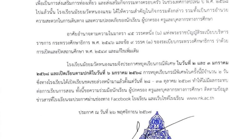 ข่าวสำหรับครูข่าวสำหรับนักเรียนประกาศ / ประชาสัมพันธ์ 26/11/2567 admin โรงเรียนมัธยมวัดหนองแขม ประกาศหยุดเรียนกรณีพิเศษ ในวันที่ 2 และ 3 มกราคม 2568 และเปิดเรียนวันที่ 6 มกราคม 2568 Read More