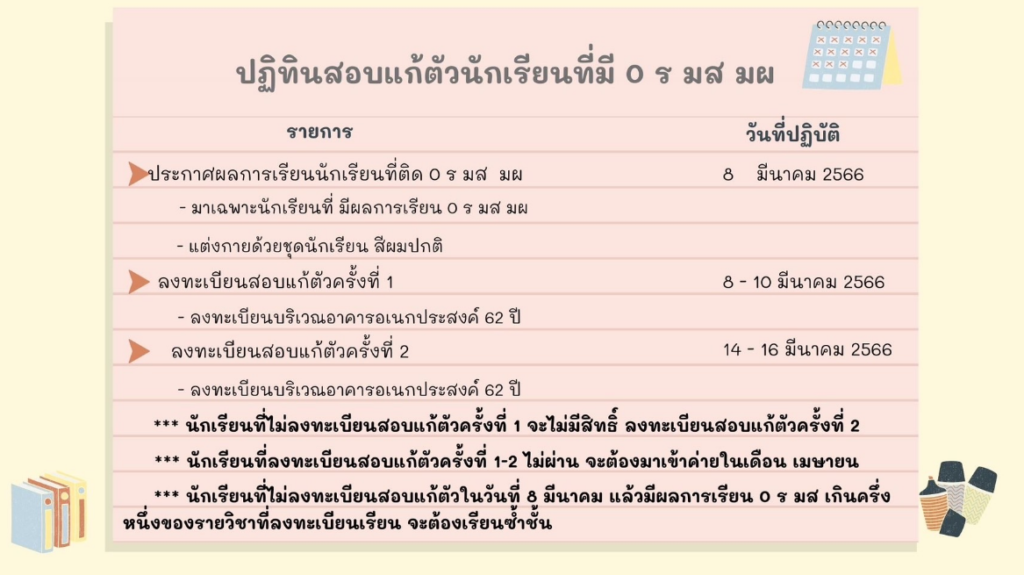 ปฏิทินสอบแก้ตัวนักเรียน ปีการศึกษา 2565