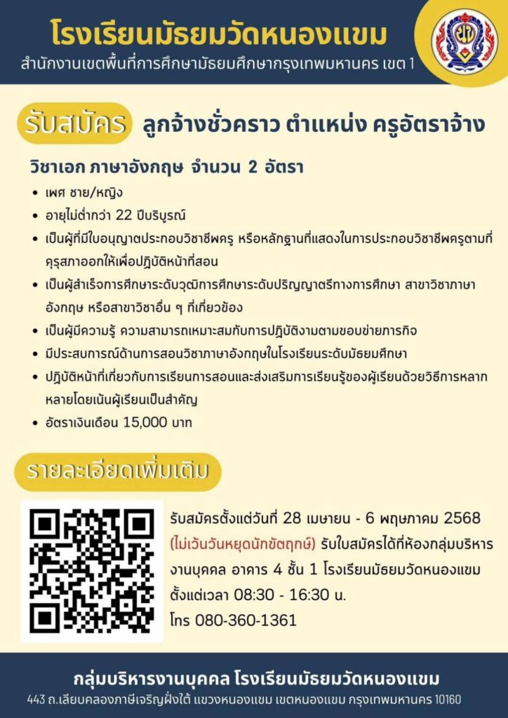 ประกาศ / ประชาสัมพันธ์ รับสมัครลูกจ้าชั่วคราว ตำแหน่ง ครูอัตราจ้าง (วิชาเอกภาษาอังกฤษ) 29/04/2568 admin จำนวนคนดู: 21