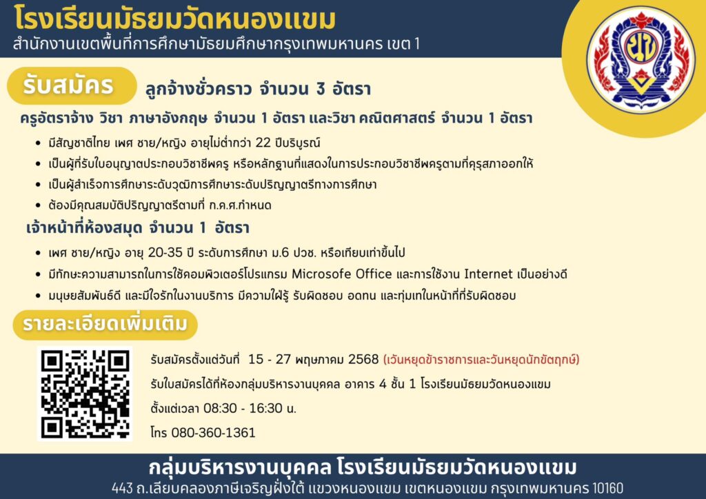 ประกาศ / ประชาสัมพันธ์ ประกาศรับสมัครลูกจ้างชั่วคราว ตำแหน่งครู อัตราจ้าง วิชาคณิตศาสตร์ วิชาภาษาอังกฤษ และเจ้าหน้าที่ห้องสมุด 15/05/2568 admin จำนวนคนดู: 45